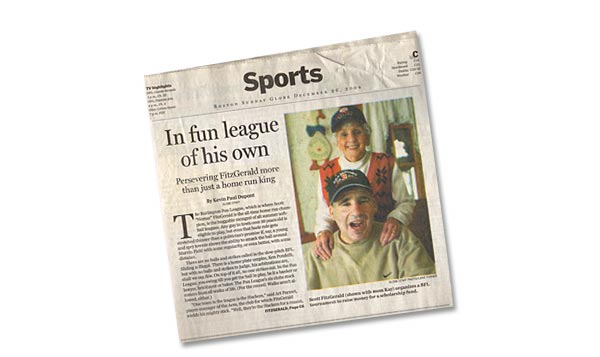 The Burlington Fun League is not a tough ticket. Most nights, there is a crowd of only one watching from the fringe. Kay FitzGerald takes in all of her son's games, and she usually arrives with transistor radio, allowing her to keep track of the Red Sox games. Part of the nightly ritual is for Kay to tell Scott the score at Fenway Park, and then for Scott to relay inning-by-inning updates to his friends on both teams. He only hits, because his reflexes are a bit slow for him to play in the field.