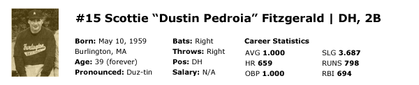 BFL vets better know the free-swinging FitzGerald by his nom de field, "Nomie" (pronounced "No-Me"). A Sox fan virtually all his life, FitzGerald through the years has picked his team favorites, dating back first to Dwight Evans, and then later Bob Stanley, and more recently, Nomar Garciaparra. They've been his guys.